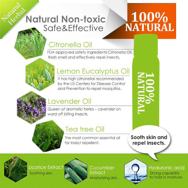 採用美國FDA公認安全物質-香茅做為防蚊首選,清新香茅味好聞又有效防蚊,產品中更加入檸檬尤加利,其中含高量香茅醛,絕對是防蚊的主要力手!